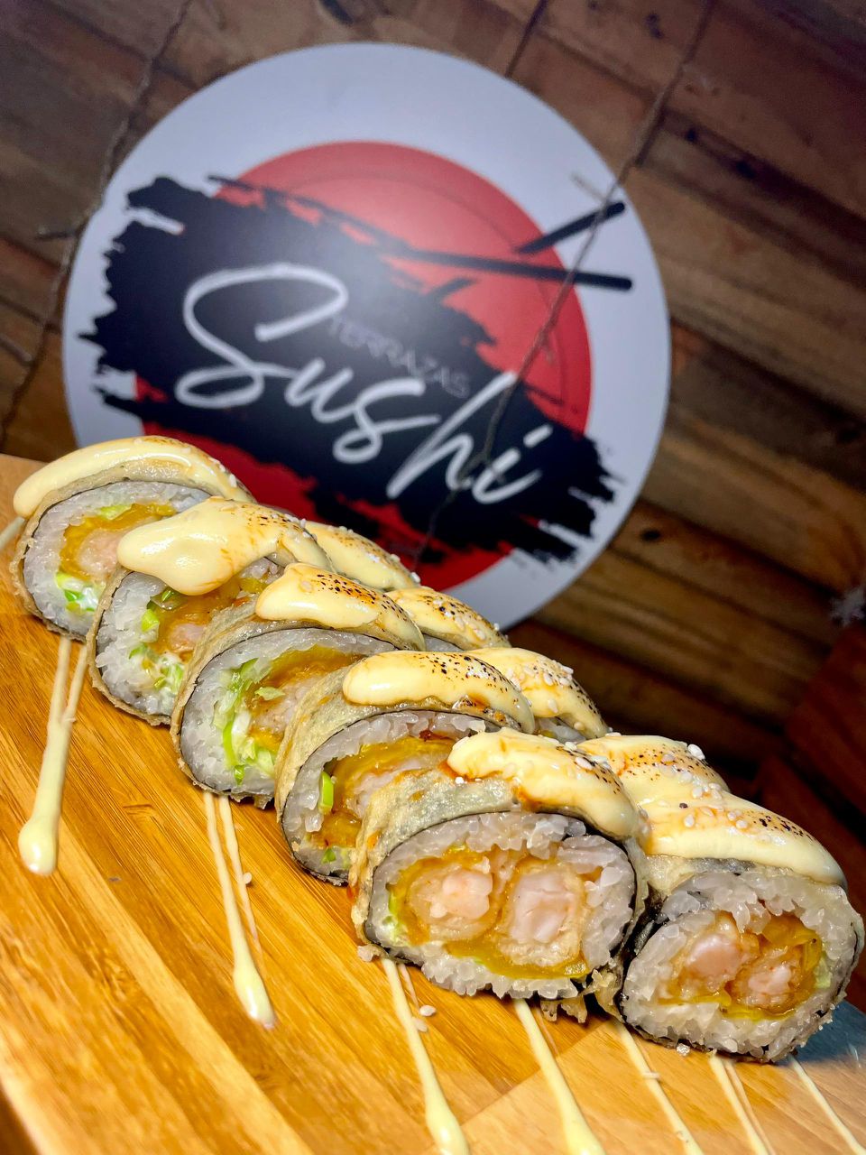 Roll tempura a base de arroz relleno de camarón empanizado, queso crema y tajada, con topping de gratinado miel