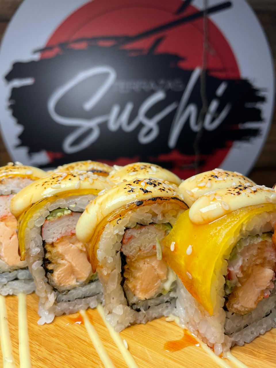 Roll a base de arroz relleno de salmón tempura, kani, queso crema y cebollín, con topping de tajada con un exquisito gratinado flameado