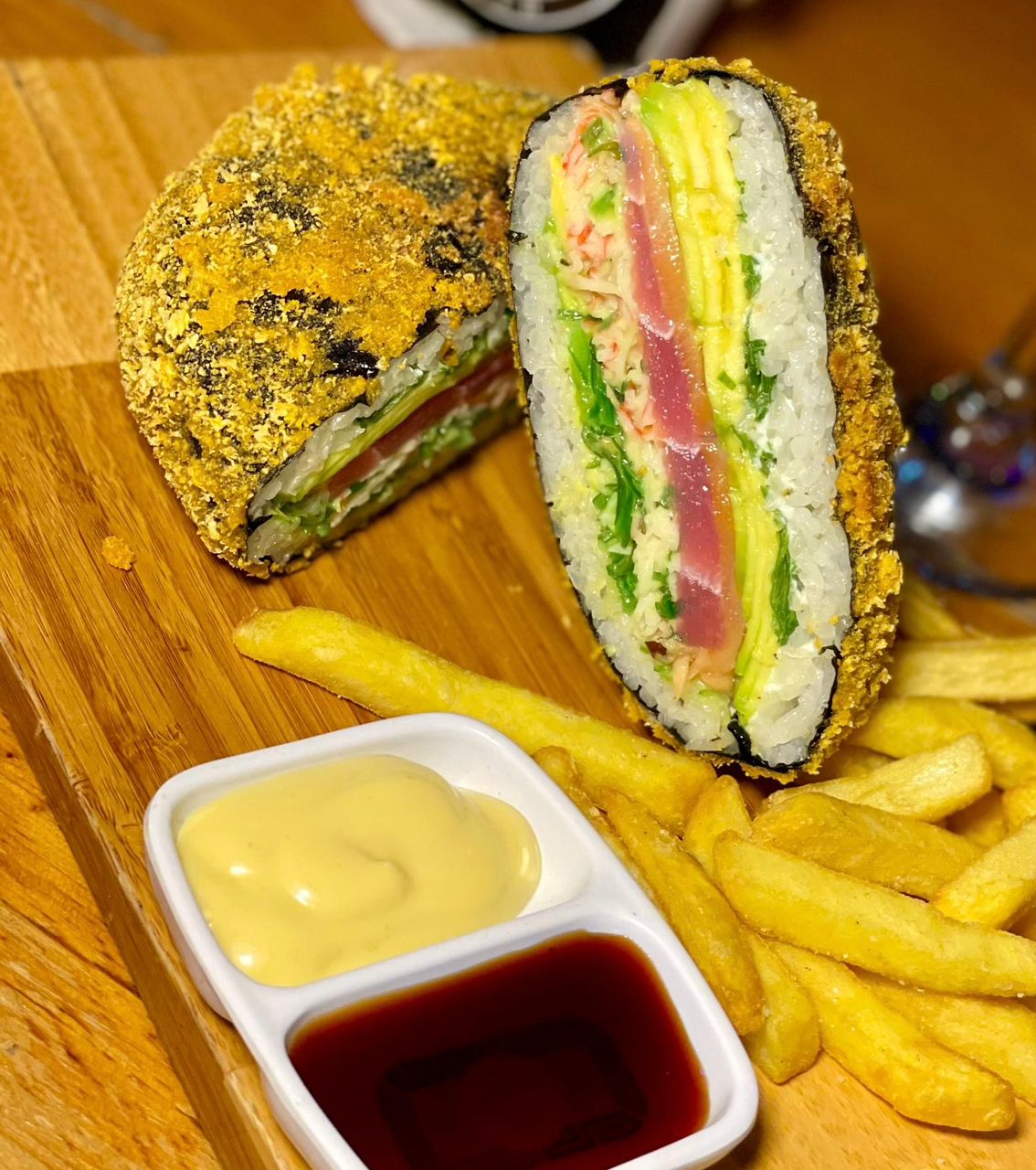 A base de arroz empanizada rellena de queso crema, salsa dragón, cebollín, salmón, atún, ensalada dinamita, aguacate y pepino. Acompañada de papas trufadas.